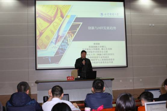 2018年3月21日晚,《坚持新发展理念的基本方略》由北京邮电大学曾剑秋教授以《创新与ICT发展趋势》为题顺利开讲,Beat365官网Beat365官方网站谢玉进老师担任主持。曾剑秋教授是英国剑桥大学博士,现任北京邮电大学经济管理学院教授、博士生导师,三网融合研究所所长,信息经济与竞争力研究中心主任,工业和信息化部科技委专家组成员,教育部管理科学与工程教指委委员,工业和信息化部ICT经济专家委员会委员,北京邮电大学经济管理学院学术委员会主席。在ICT产业政策与市场、企业竞争力、网络融合、5G技术演进、大数据、人工智能、物联网等方面有深入的研究与独到见解。曾教授的授课注重互动,以同学们关心的问题开场,紧密结合“创新”这一主题词,深入浅出地结合我国信息技术的发展诠释了什么叫创新和如何创新等基本问题。曾教授的讲授紧贴时政热点和学生关注点,深刻梳理了2018年政府工作报告和党的十九大报告关于创新的相关论述,对“互联网+”行动计划、“国家大数据战略”“网络强国”等国家战略和部署,进而从创新与智慧社会、国家创新体系建设、智慧社会与智慧城市、宽带中国与信息消费、信息化政策与ICT市场开放、大数据、人工智能与实体经济等方面对我国当前的信息化战略落实、网络强国建设、宽带、数字经济与5G技术、大数据、人工智能和物联网发展及前景进行了详尽的讲解。曾教授的讲授平实而有力、质朴而前沿,深入浅出,娓娓道来,极大地开拓了在场师生的视野,深化了对科技创新的认识和理解。谢玉进老师用“内行、前沿、高端”六个关键词对曾教授的精彩讲授进行了点评,认为曾教授用非常有限的时间系统地清晰明快地梳理了我国复杂的信息化进程,带领同学们很好地领略了ICT发展最前沿的技术风采和社会可能性,带给大家一种高端的资讯冲击和深刻的创新思考,很好地诠释了什么是创新,并内含着如何创新的方法论,对同学们理解创新发展理念有着极大的帮助。200余名同学现场聆听了授课,反响十分热烈。