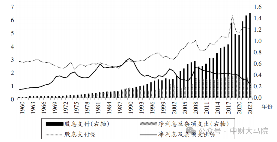 图1:1960-2023年美国非金融企业部门股息与利息支出及其占GDP的比重(单位:万亿美元)