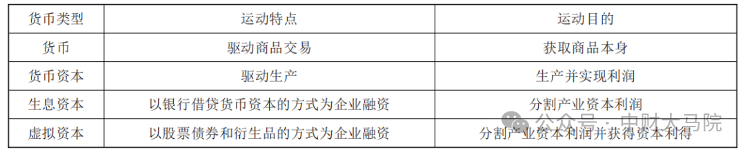 一般而言,货币资本更多对应了自筹资金的产业资本,生息资本对应了以银行为代表的间接融资体系,虚拟资本对应了以债券、股票与衍生品为代表的直接融资体系。不同形态的资本积累模式具有显著差异。对于产业资本而言,其利润的来源在于雇佣工人生产的剩余价值,在完成产品的生产销售过程后获得利润。对于生息资本而言,银行向企业贷款,由企业投资生产赚取利润后,银行再以利息的方式从利润中进行分割。对于虚拟资本而言,其利润来源则更加多元,既有债券利息为代表的利息收入,也有股票分红为代表的股息收入,以及包括衍生品在内的金融产品自身价格上涨带来的资本利得。表1对这些不同的生产关系下不同的货币金融运行逻辑进行了相应的总结归纳。流通中的货币永远都对应着商品与服务的交易,只对流通中的货币进行考察,难以区别出不同的货币在其中发挥的不同职能与背后的生产关系。马克思创见性地在社会生产的过程中以不同的社会生产关系对不同的货币金融类型进行了区分,指出货币在不同的社会生产关系下承担了不同角色,揭示出不同资本间相异的积累模式。