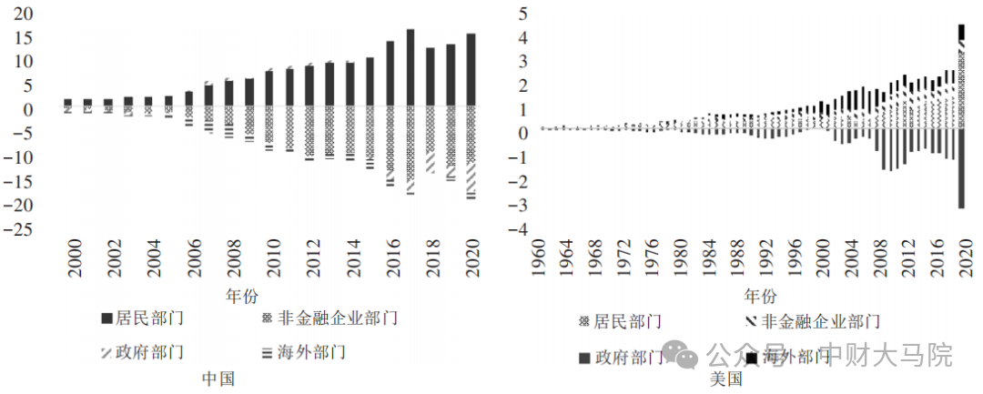 图2:中美居民部门、非金融企业部门、政府部门与海外部门净储蓄(1960-2020年),单位:(万亿人民币、万亿美元))