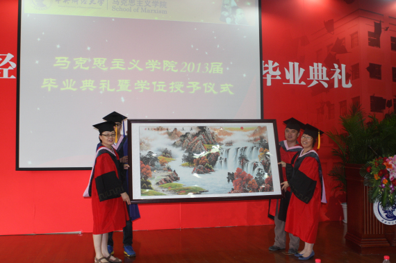 随后,2013届全体硕博毕业生一同在台上接受了导师亲手赠送的毕业纪念礼品,毕业生们满怀对学院、对恩师的浓浓感激之情回赠学院一副山水画匾留念。
