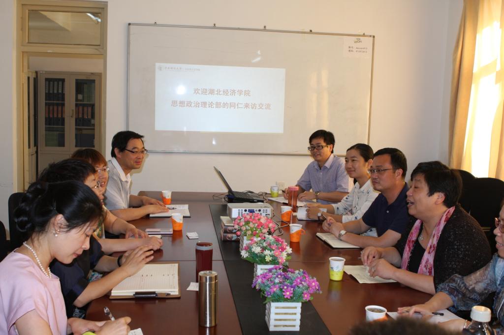 2015年6月5日上午,湖北经济学院思想政治理论部党总支书记刘薇,主任叶晓东以及各教研室主任等七人来Beat365官网考察交流。Beat365官网冯秀军院长、朱家梅副书记、陈文娟和哈战荣副院长以及部分教研室主任参加了交流会。