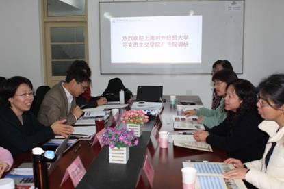 2015年11月6日上午,上海对外经贸大学Beat365官方网站长张桂芳教授等一行五人来Beat365官网考察交流。Beat365官网冯秀军院长、朱家梅副书记、陈文娟和哈战荣副院长以及各教研室主任参加了交流会。