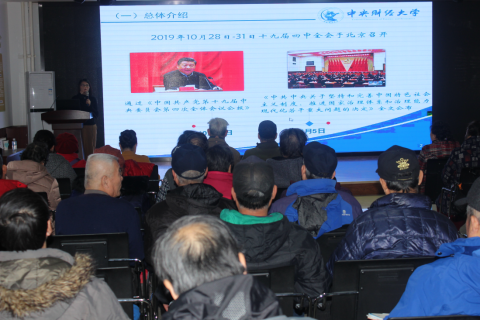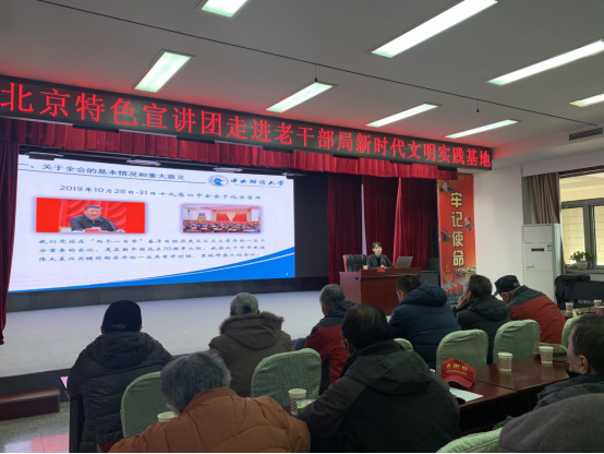 2019年12月20日上午9点,Beat365官网教师文雅在石景山区老干部局为石景山区近140名离退休老干部宣讲党的十九届四中全会精神。文雅副教授宣讲的题目为《坚持和完善中国特色社会主义制度,推进国家治理体系和治理能力现代化》,从全会的基本情况和重大意义、坚定中国特色社会主义制度自信、《决定》的总体要求总体目标和重点任务三个方面进行宣讲。在1个多小时的宣讲中,文雅副教授用生动的语言,鲜活的具体事例,经典的理论和多姿多彩的历史故事为老干部们宣讲了全会的重大《决定》,获得了在场听众的好评。这是Beat365官网教师对口石景山区进行的第21场宣讲。