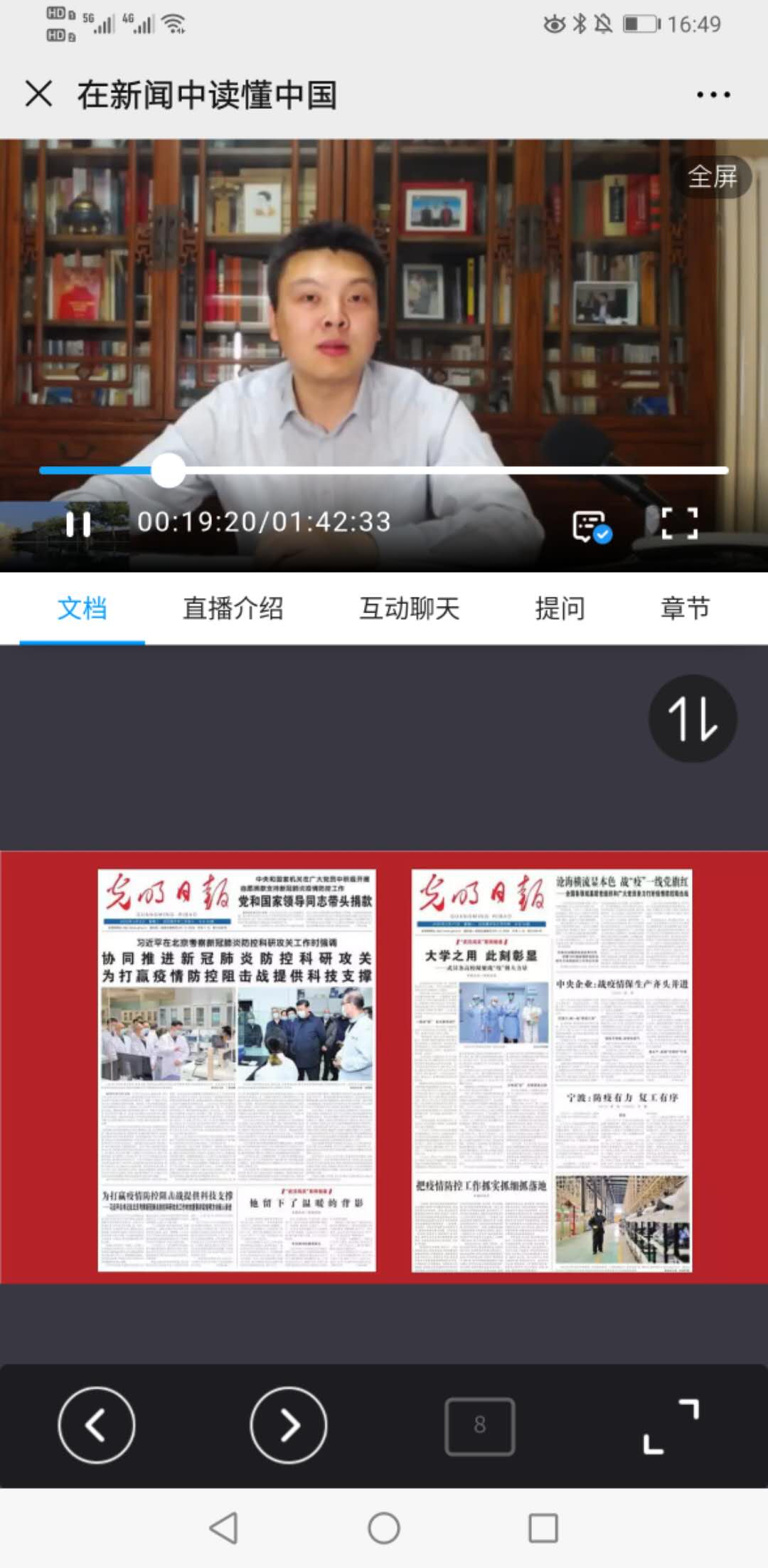 董城以中央党报的风向标——报纸一版头条为观察视野,带领大家重温了疫情发生后新闻媒体的动向,回顾了从中央政治局常务委员会研究新型冠状病毒感染的肺炎疫情防控工作,直到3月11日习近平总书记在湖北省,强调毫不放松抓紧抓实抓细各项防控工作,坚决打赢湖北保卫战武汉保卫战这一段最为关键的时期,总书记亲自部署、亲自指挥,全国各族人民众志成城,有关各方统筹“全国一盘棋”,协调联动之中创造的一个又一个中国奇迹。中国人民战“疫”的整个过程,再一次充分彰显了没有任何力量能够撼动我们伟大祖国的地位,没有任何力量能够阻挡中国人民和中华民族的前进步伐。