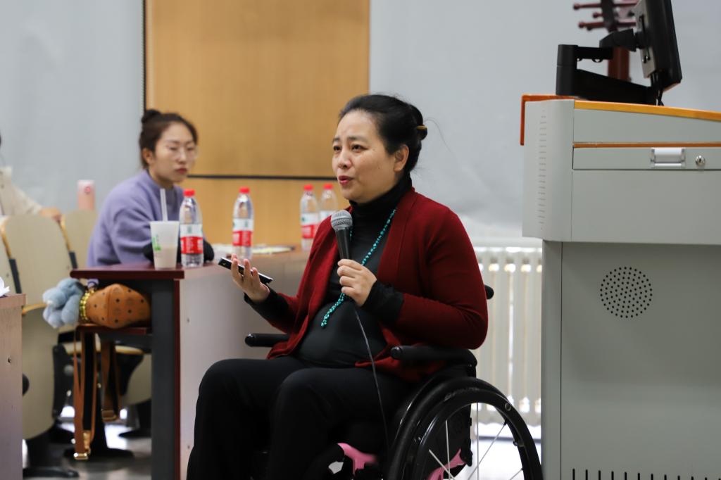 李楠老师以《助力圆梦,成就价值》为题讲述了她在25岁的青春年华遭遇车祸后5年康复治疗,以高位截瘫的身体与生命斗争,在生活中磨练意志,积极投身助残事业帮助他人、奉献自我实现人生华丽蝶变的故事。李楠老师向在场师生展示了部分残疾人的成功案例和她与团队成员助残、为残的感人事迹,深刻阐述了她对生命的认识以及从事助残服务事业的体会,认为“最好的‘照顾’往往是悄无声息的,以社会全体成员十分熟悉的方式。”李楠老师还呼吁人们关心残疾人、爱护残疾人、接纳残疾人,邀请青年大学生参与助残服务事业。讲课结束后,学生代表向李楠老师献上鲜花,送上祝福。