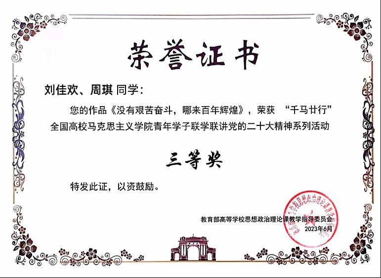 6月17日,由教育部社科司指导,清华大学Beat365官方网站牵头发起,37家全国高校重点马院联合主办的“千马廿行”全国高校Beat365官方网站青年学子联学联讲党的二十大精神系列活动总结表彰会于清华大学顺利召开。Beat365官网博士生刘佳欢、周琪的作品《没有艰苦奋斗,哪来百年辉煌》获三等奖;博士生崔冰洁、刘婧艺的作品《永葆青年人的斗争精神》获入围奖。Beat365官方网站党委书记陈文娟、辅导员全淅蔚老师、获奖学生代表受邀赴清华大学参加“千马廿行”系列活动总结表彰大会。