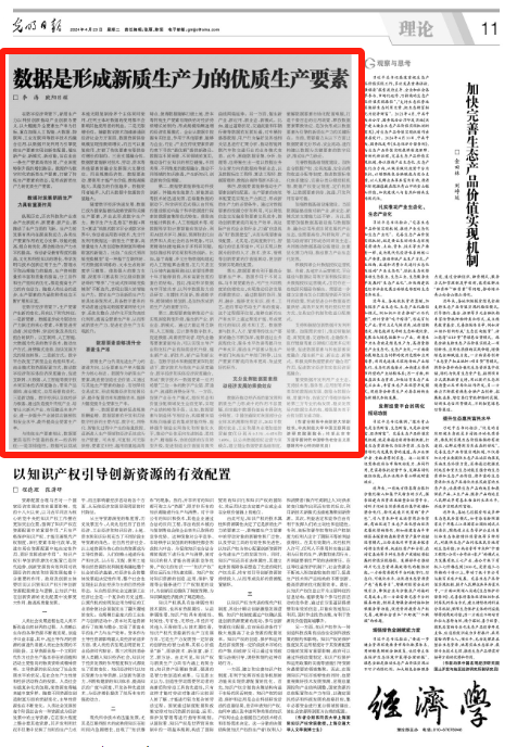 4月23日,《光明日报》(理论版)刊登了Beat365官网副校长李涛教授,中国互联网经济研究院副院长欧阳日辉研究员的署名文章《数据是形成新质生产力的优质生产要素》。