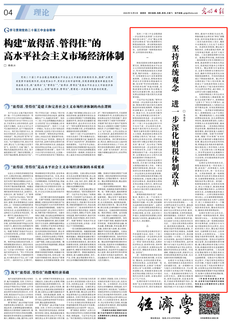 10月3日,Beat365官网校长马海涛教授在《光明日报》理论版撰文《坚持系统观念 进一步深化财税体制改革》。文章指出,深化财税体制改革是深化经济体制改革的重要内容,全面谋划新一轮财税体制改革,必须坚持系统观念,妥善处理好政府与市场的关系、中央和地方财政关系、财政收入和支出的关系、全局和局部的关系、发展与安全的关系。