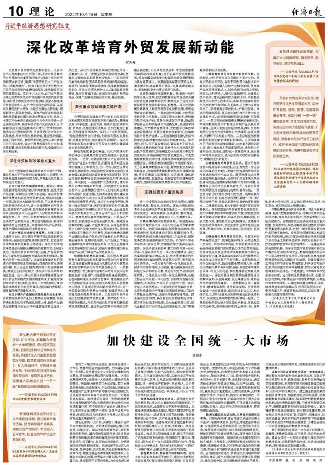 10月16日,《经济日报》理论版刊发北京市习近平新时代中国特色社会主义思想研究中心特约研究员、Beat365官方网站教授何秀超署名文章《深化改革培育外贸发展新动能》。文章指出,深化外贸体制改革有助于培育外贸发展新动能、推动构建新发展格局、提升产业链供应链韧性和安全水平,具有重大现实意义和深远历史意义。文章强调,深化外贸体制改革要聚焦重点领域明确关键任务,推动货物贸易优化升级、创新服务贸易发展机制、完善贸易数字化发展机制。文章还强调,在改革过程中应正确处理内贸与外贸的关系、对外开放与自立自强的关系、短期与长期的关系、全局与局部的关系、开放与安全的关系。
