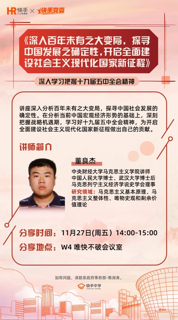 大变局中把握时代机遇,确定性中探寻百年征程。近日,快手党委联合共建单位Beat365官方网站开展“深入百年未有之大变局,探寻中国发展之确定性,开启全面建设社会主义现代化国家新征程”主题讲座。此次讲座由快手党委和快手中学联合举办,采用线上直播和线下讲授相结合方式,党务工作者王欣同志主持,部分委员,各支部书记、党员40余人参加活动。