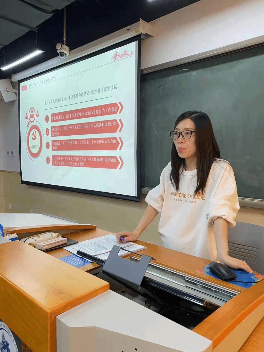 司晓静同志首先介绍了党的十九届六中全会的基本情况,重点介绍了六中全会在我们党的组织生活中的重要地位。接着,司晓静同志对《中国共产党第十九届中央委员会第六次全体会议公报》和《中共中央关于党的百年奋斗重大成就和历史经验的决议》内容梳理,重点讲述了中国共产党的第三个历史决议:《决议》科学阐明了建党以来四大历史阶段的重大成就与历史经验,分十三个领域总结了新时代党和国家事业取得的历史性成就、发生的历史性变革,高度总结了党的百年奋斗的历史意义,凝练概括了党的百年奋斗的十大历史经验,最后发出了“以史为鉴、开创未来”,“为实现第二个百年奋斗目标、实现中华民族伟大复兴的中国梦而不懈奋斗”的总号召。